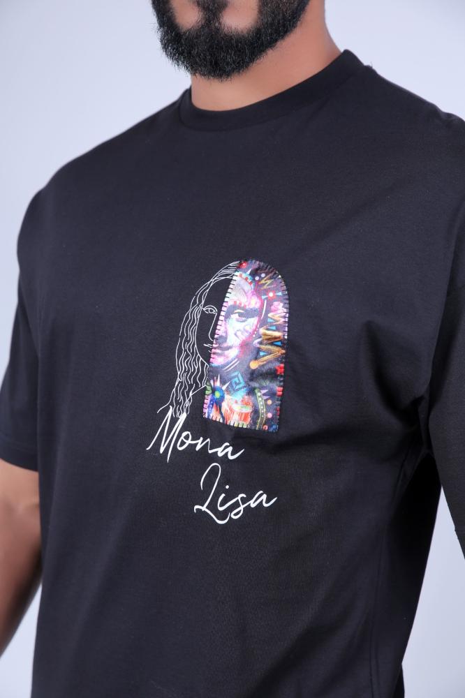 تيشرت أسود قصير الأكمام من قماش قطن، مزين بطباعة فنية على الصدر وطبعة خلفية، يجمع بين الأناقة والراحة